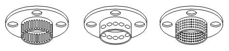 a、混合用定子头四周均布精密加工的垂直的长圆形的孔。 b、该混合乳化头主要适用于高粘度物料的混合、颗粒细化。较大程度地提供剪切表面,介质或颗粒通过混合头时尺寸被迅速减小,提高了混合乳化效果。用途广。 2、大圆孔(图2) a、主要起粉碎作用。定子头四周均布较大直径圆形通孔。 b、大圆孔主要用于普通混合工艺中减小物料颗粒尺寸。头内圆形通孔使介质更好地作环形运动,适用于中等粘度物料的循环。 3、小圆孔(图3) a、定子头四周均布精密加工的小圆形孔。 b、乳化头主要用于解决困难的乳化工艺和极精细粉粒的悬浮。