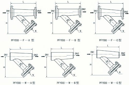 (3)Y型铸造异径法兰连接式(PFYDI一F型)、异径对焊连接式(PYFDI—W型)(DN40×32-250×200,PN≤5.OMPa)